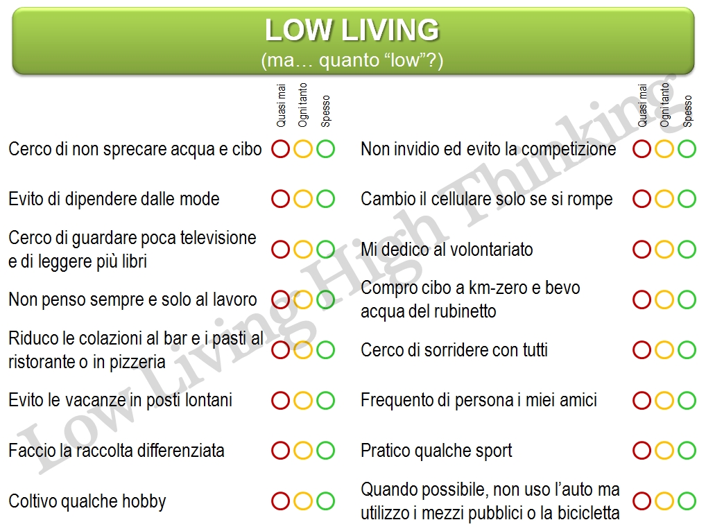 Quella che propongo ora, senza alcuna pretesa di scientificità, è una semplice “lista della spesa”, anch’essa estrapolata – come altre slide pubblicate in precedenza – da un mio recente lavoro su questi temi. Se vivere “low” è dunque l’obiettivo, se vivere “low” è dunque l’incognita che – in tanti ormai sosteniamo – può consentirci di affrontare l’avvenire nel modo meno traumatico possibile, quello che segue è un banalissimo elenco di piccole azioni e comportamenti che ognuno di noi, nella sua quotidianità, può liberamente scegliere di adottare per abituarsi pian piano ad un “regime esistenziale” diverso, più… leggero. Il rispetto o meno di queste abitudini – o forse dovrei dire “disabitudini” – non prevede una pagella! Non è un test psicologico! Non si dà un punteggio ad ogni risposta, per poi far dipendere da quanto si è totalizzato l’interpretazione di un comportamento! Soprattutto, non è un gioco!