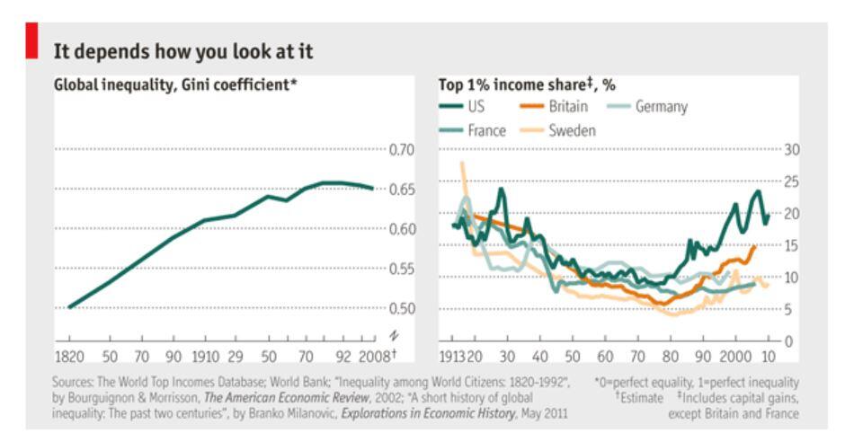 Si può notare abbastanza chiaramente, nel grafico di sinistra, come la disuguaglianza fra nazioni sia aumentata ininterrottamente – per circa un secolo e mezzo – fino alla fine degli anni Settanta. Dopodiché, come dicevamo sopra e “grazie” alla spinta della globalizzazione, questa ha cominciato a flettere. A quale prezzo, però? Ce lo dice il grafico di destra, in cui viene indicato, per cinque economie sviluppate, la quota di ricchezza complessiva detenuta dal più ricco 1% della popolazione. Guarda caso, questa quota comincia ad aumentare proprio alla fine degli anni Settanta! Come a dire che a beneficiare in primis del riassetto geopolitico mondiale, finalizzato alla convergenza fra intere economie, sono stati invece pochi, selezionatissimi individui: appunto l’uno per cento della popolazione, che ha così potuto concentrare nelle proprie mani una fetta progressivamente più consistente del reddito nazionale disponibile. Ovviamente, a discapito del restante 99%.