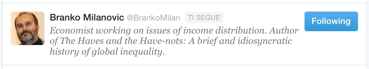 Lo scorso Aprile, come qualcuno di voi forse ricorderà, ho pubblicato un articolo in cui illustravo una sintesi del rivoluzionario studio sulle disuguaglianze economiche di Branko Milanovic, figura di spicco a livello internazionale nella diagnosi delle iniquità distributive, nonché lead-economist della Banca Mondiale (banca che – ricordo – non è spudoratamente orientata al profitto, ma ha tra i suoi obiettivi la lotta contro la povertà tramite il finanziamento dei Paesi in difficoltà). In quell’occasione, riuscii persino in qualche modo a segnalare il mio post al diretto interessato, il quale – con mio grande orgoglio – è da allora diventato un seguace di LLHT: