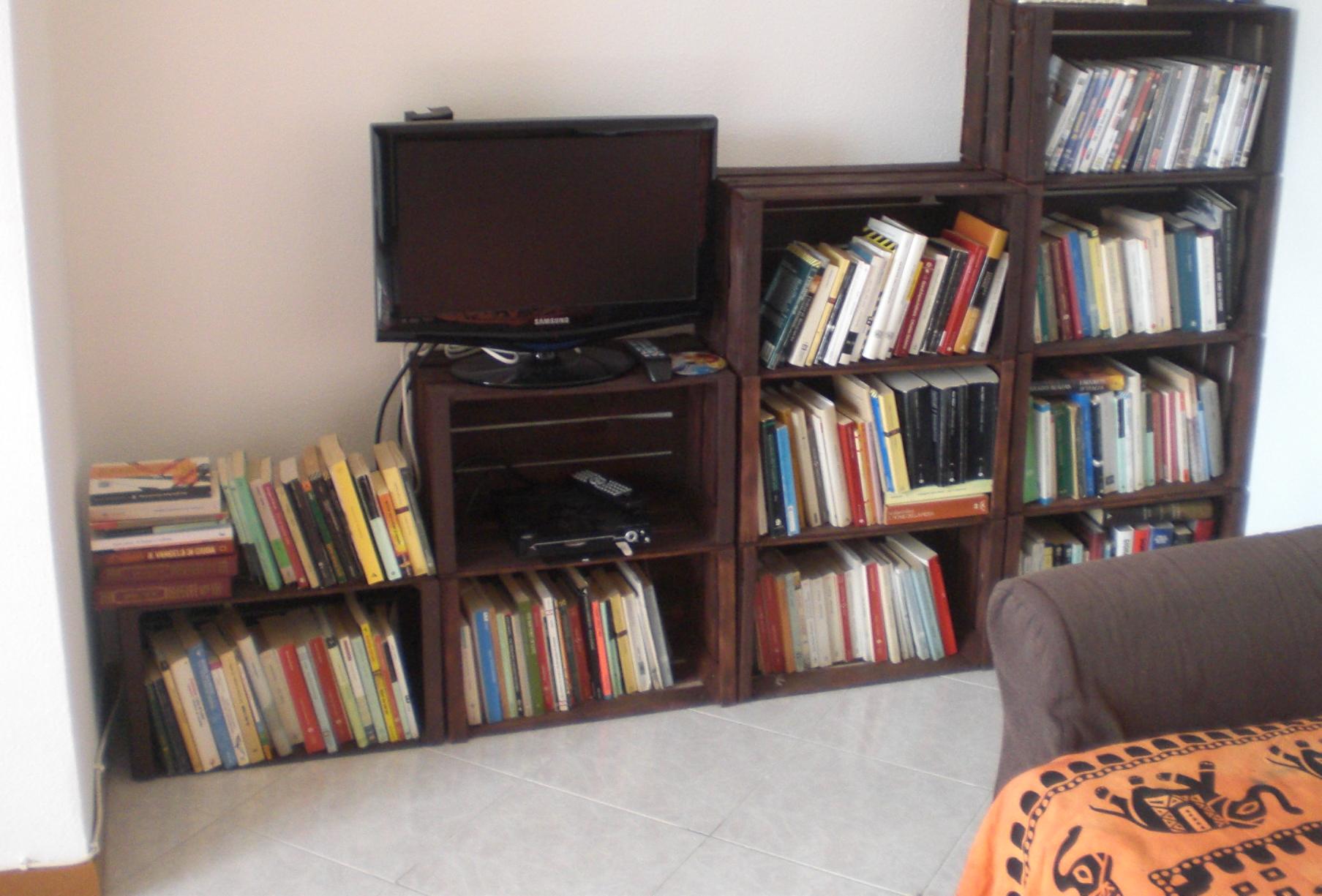 Ti mando qualche foto perché avevo voglia di farti vedere il mio mobile del salotto fatto da me. Cassette della frutta buttate ai lati del mercato o regalate dal mio fruttivendolo. Le ho pulite, scartavetrate e pitturate… Ecco il risultato: