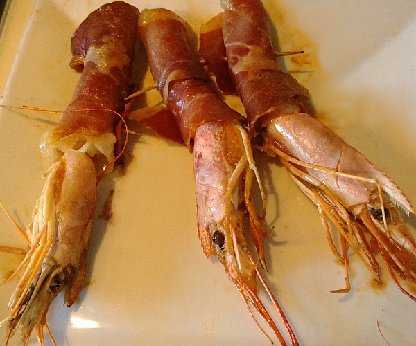 Spiedini di gamberoni in crosta di crudo. Questa ricetta me l’ha insegnata un mio amico che gestisce un ristorante. Molto onestamente, già chiamarla “ricetta” è pretenzioso, trattandosi sostanzialmente di una… idea “tradotta” in piatto da portata! Ma, a mio avviso, sono proprio queste cose semplici e geniali le più apprezzabili e gustose. Per farla breve: pulire i gamberi lasciandoli attaccati alla testa, avvolgerli in una fetta di prosciutto crudo (fissandola con uno stuzzicadente) e far cuocere in una padella antiaderente spalmata con un solo cucchiaino d’olio. Quando il crudo si abbrustolisce, a tavola!