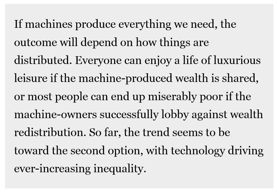 Se le macchine producono tutto ciò di cui abbiamo bisogno, il risultato dipenderà da come questo sarà distribuito. Chiunque potrà godersi una vita di piacere soltanto se il benessere prodotto dalle macchine sarà condiviso, altrimenti – qualora le lobby tecnologiche si opporranno alla distribuzione di ricchezza – la maggior parte delle persone scivolerà in condizioni di povertà. Ad oggi, il trend sembra orientato alla seconda opzione, con la tecnologia che spinge iniquità continuamente crescenti. (S. Hawking)