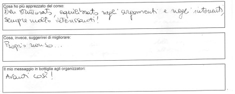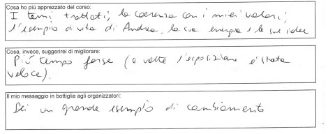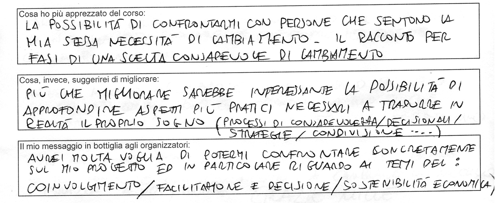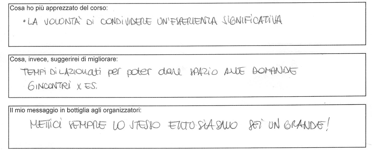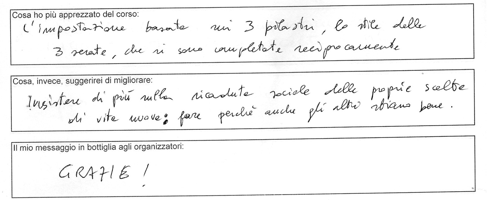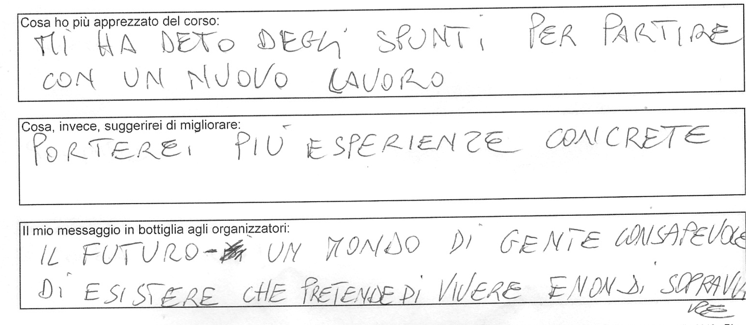 9. Ho sempre vissuto un po’ “fuori dal mondo” perché mi sono sempre sentita inadeguata, cambiavo lavoro in continuazione, alla disperata ricerca di un posto “giusto” in cui collocarmi, in cui sentirmi a mio agio e non riuscivo a capire cosa stavo sbagliando… Poi, frequentando il corso, ho capito che non occorre omologarsi e che ci sono altre persone che vivono la mia stessa situazione. Ho scoperto modi nuovi di vivere, ho capito che ci sono tante possibili situazioni in cui posso sentirmi a mio agio, con persone che la pensano come me. Ad oggi ho deciso di investire il mio tempo girando un po’, per vedere e vivere alcune di queste situazioni. In tutti i modi, questo corso, mi ha spronato ad andare avanti, mi ha fatto capire che non sono pazza (come mi hanno spesso etichettato le persone che ho incontrato nel mio quotidiano), mi ha dato il coraggio per andare avanti ad esplorare. Ora tocca a me concretizzare. In ogni caso voglio ringraziare tutti i relatori e gli organizzatori del corso perché probabilmente, senza di loro, sarei ancora ferma a chiedermi dove sto sbagliando. Grazie mille e spero che le nostre strade si incroceranno ancora.