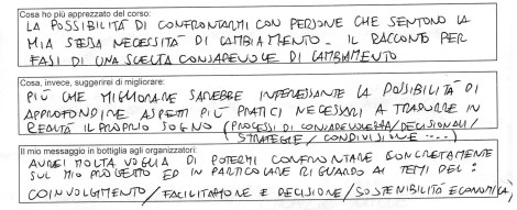 5. Prima di tutto un abbraccio a tutti E’ stata una bella esperienza basata sulla condivisione e sul confronto. C’era chi era lì semplicemente per curiosità, chi per iniziare a scoprire ed immaginare percorsi nuovi in grado di dare risposte a bisogni insoddisfatti, chi già proiettato in una consapevolezza di cambiamento ma ancora alla ricerca della giusta via, chi già con un progetto in testa. Motivazioni differenti, stati d’animo differenti, aspettative differenti. Ma queste diversità si sono come ricomposte in un sentire comune che non è altro che quello della possibilità di condividere e confrontarsi. Per quanto mi riguarda questo è il lato più bello di questa esperienza, un momento nel quale ho potuto parlare di me liberamente, senza timore di giudizi o etichette. Un momento nel quale ho potuto condividere le mie idee, i miei bisogni, i miei sogni, ma anche le mie incertezze e paure in maniera trasparente e sincera. I percorsi di mutazione passano anche per piccole cose come questa. Sono sempre più convinto che l’unica strada davvero percorribile sia quella di dedicarsi alla propria personale educazione al cambiamento, una iniezione quotidiana di autenticità, distillata a piccole gocce, che solo nella perseveranza potrà consentire di riempire i vuoti e le mancanze per poter riconoscere i propri reali bisogni. Questo è l’augurio che rivolgo a tutti noi.