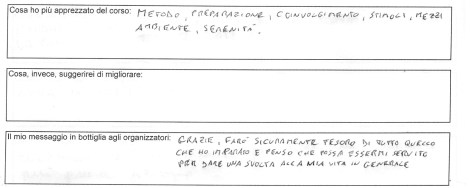 10. Quando l’anno scorso ho deciso di scollocarmi non sapevo neanche che esistesse questo termine e poi la mia visione di cambiamento si limitava all’idea di trovare un’altra azienda possibilmente vicino a casa. Dopo questo stupendo corso invece riparto dalla convinzione che ci sono un mondo di possibilità per migliorare la mia vita, non solo professionale. Grazie per la formazione e per questa iniezione di fiducia suffragata dalla rinnovata consapevolezza di non essere solo e di potercela fare.