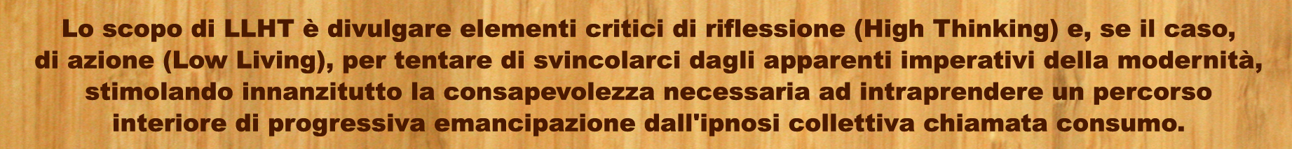 Già dopo i primi mesi di vita di LLHT, ho ricevuto diverse proposte di inserimento nella homepage di alcuni banner promozionali. Non nego che, come potete ben immaginare, ottenere due soldi senza muovere un dito mi avrebbe fatto (e mi farebbe tuttora) molto comodo. Ma ho preferito l’integrità, quindi ho rifiutato. Primo, perché ritenevo tale opzione incoerente con lo spirito di questo progetto, che è e resta essenzialmente di divulgazione culturale. Secondo, perché sono convinto che molti lettori di LLHT, apprezzando il valore e la gratuità dei suoi contenuti, si predispongano poi a premiarla mediante il passaparola e l’acquisto dei miei libri (considero infatti il libro l’unico bene che – se edito da case editrici “sane” – proprio perché divulga cultura, si sottrae implicitamente ai dogmi mercantili).